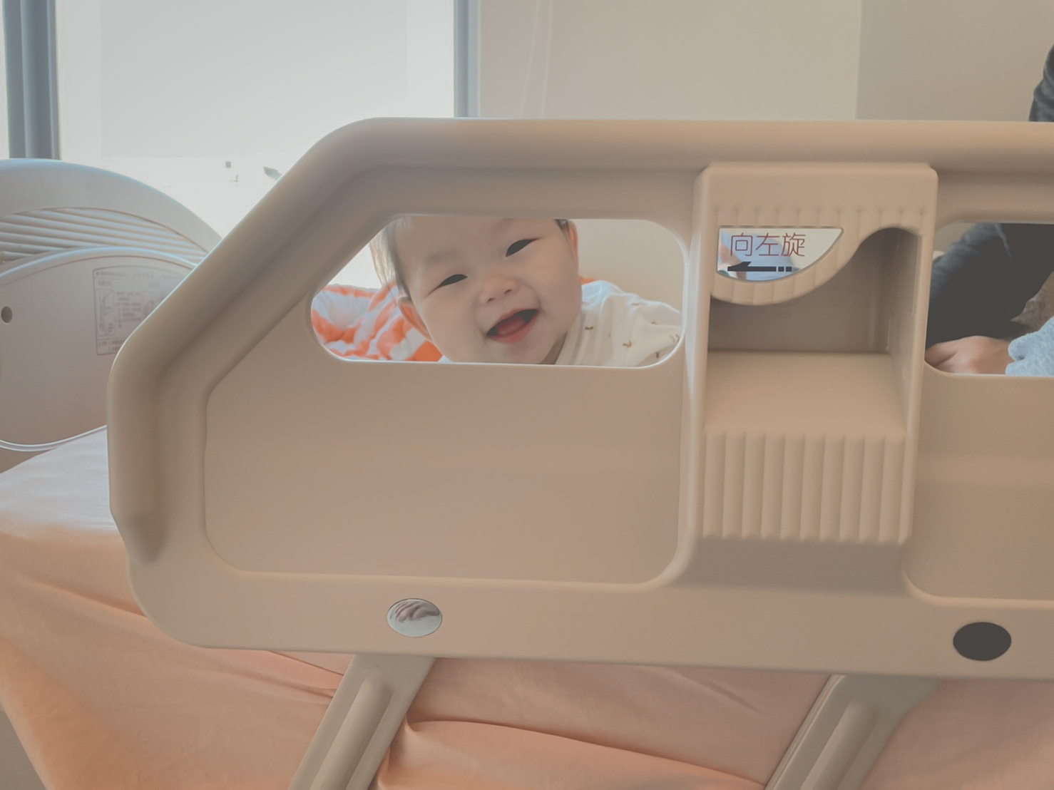 住院的最後兩天,秧病情好轉許多,精神活力恢復以往,一身蠻力,把整組點滴架子給扯掉解體,還把自己腳上的病人識別環給扯斷,我都扯不斷的東西真不知道他怎麼辦到的?令爸媽有點哭笑不得。心情變好開始笑嘻嘻的,而且愛上了病床旁的跳跳虎,當她想哭時,把她抱去看跳跳虎,馬上就眉開眼笑。讓我們心情也跟著稍稍放鬆,欣慰著我勇敢又開朗的女兒,經歷這一切後還是沒有遺失他自己,護理師們都稱讚秧愛笑又淡定,就算每次被護理師抱走不是去扎針就是抽痰,秧還是從不抗拒任何一個護理師的懷抱,誰都可以把他抱走,還會給人家甜甜的笑,這麼勇敢又可愛的秧只叫我們又愛又心疼。